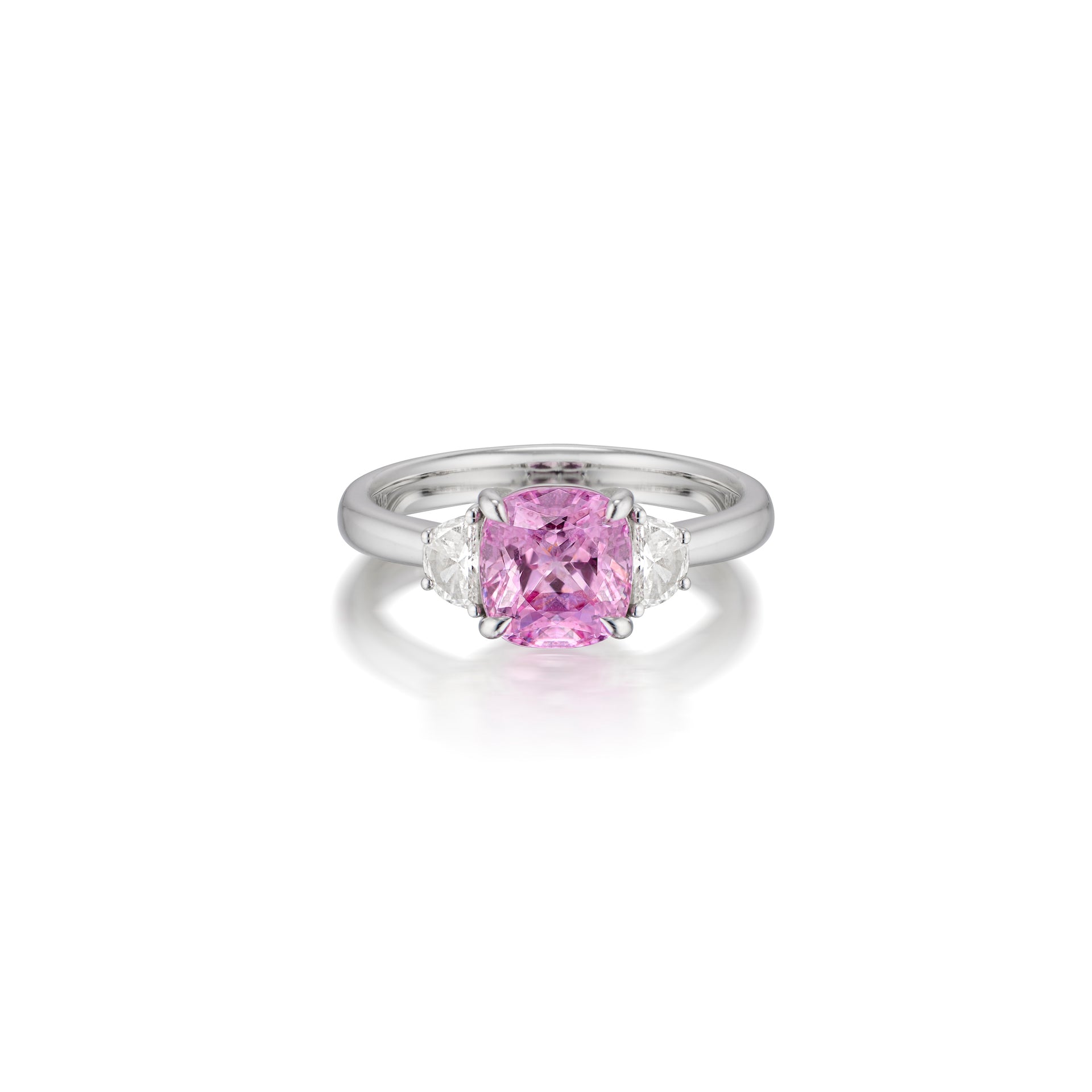The captivating hue of the pink sapphire evokes a sense of romance and femininity, drawing admiration from all who behold it. Flanking the center stone are two trapezoid diamonds totalling 0.29 carats, meticulously selected for their impeccable cut and clarity, creating a harmonious balance of grace and sophistication.