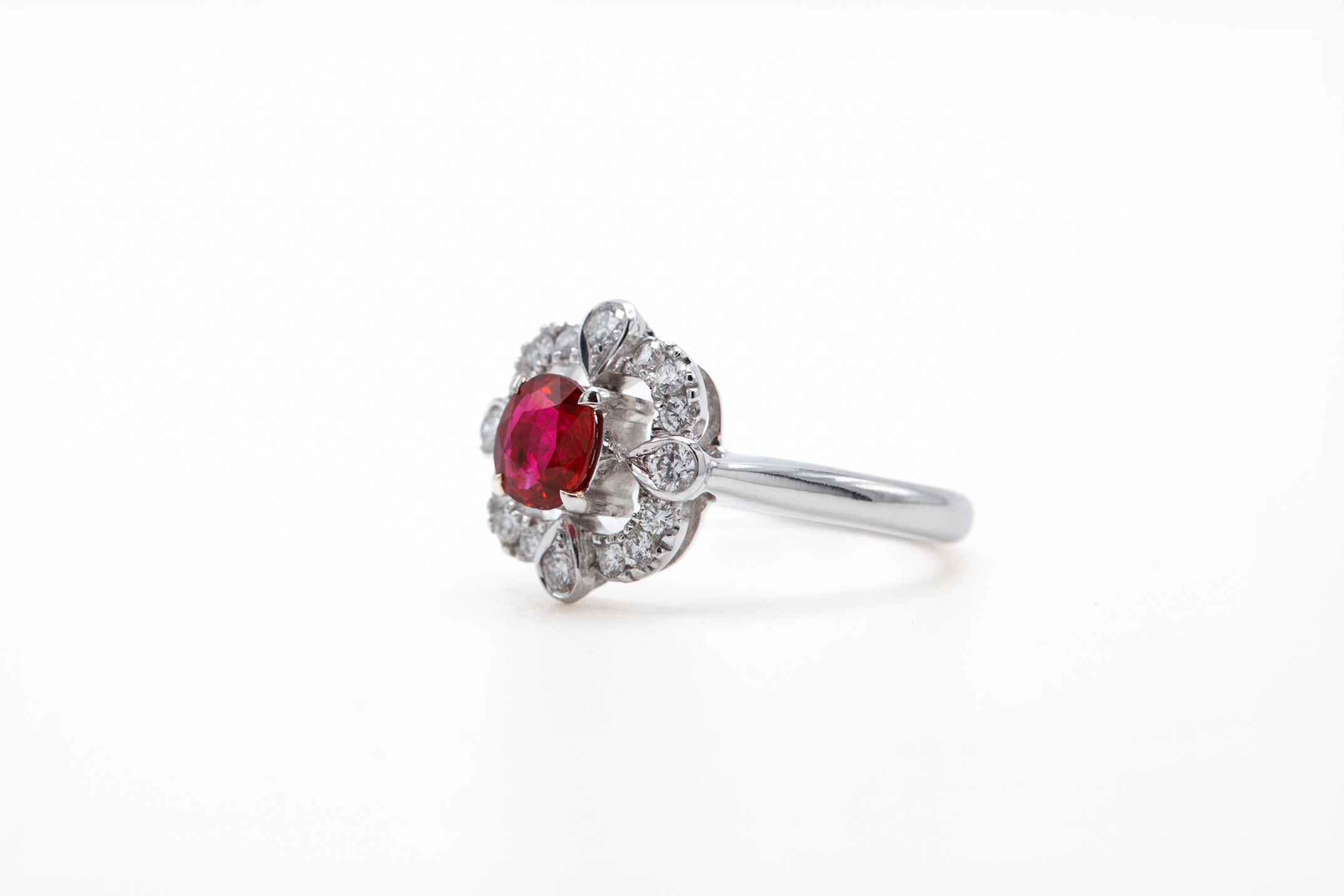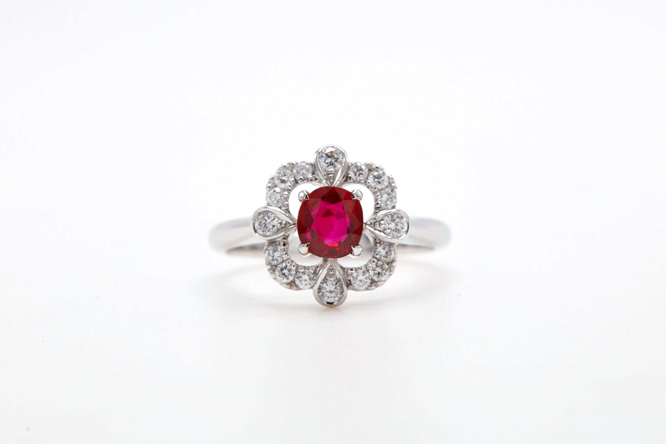 The mesmerizing 0.71-carat Burma No Heat Ruby, ablaze with passionate radiance, is gently framed by 16 resplendent diamonds, their combined weight totaling 0.62 carats.