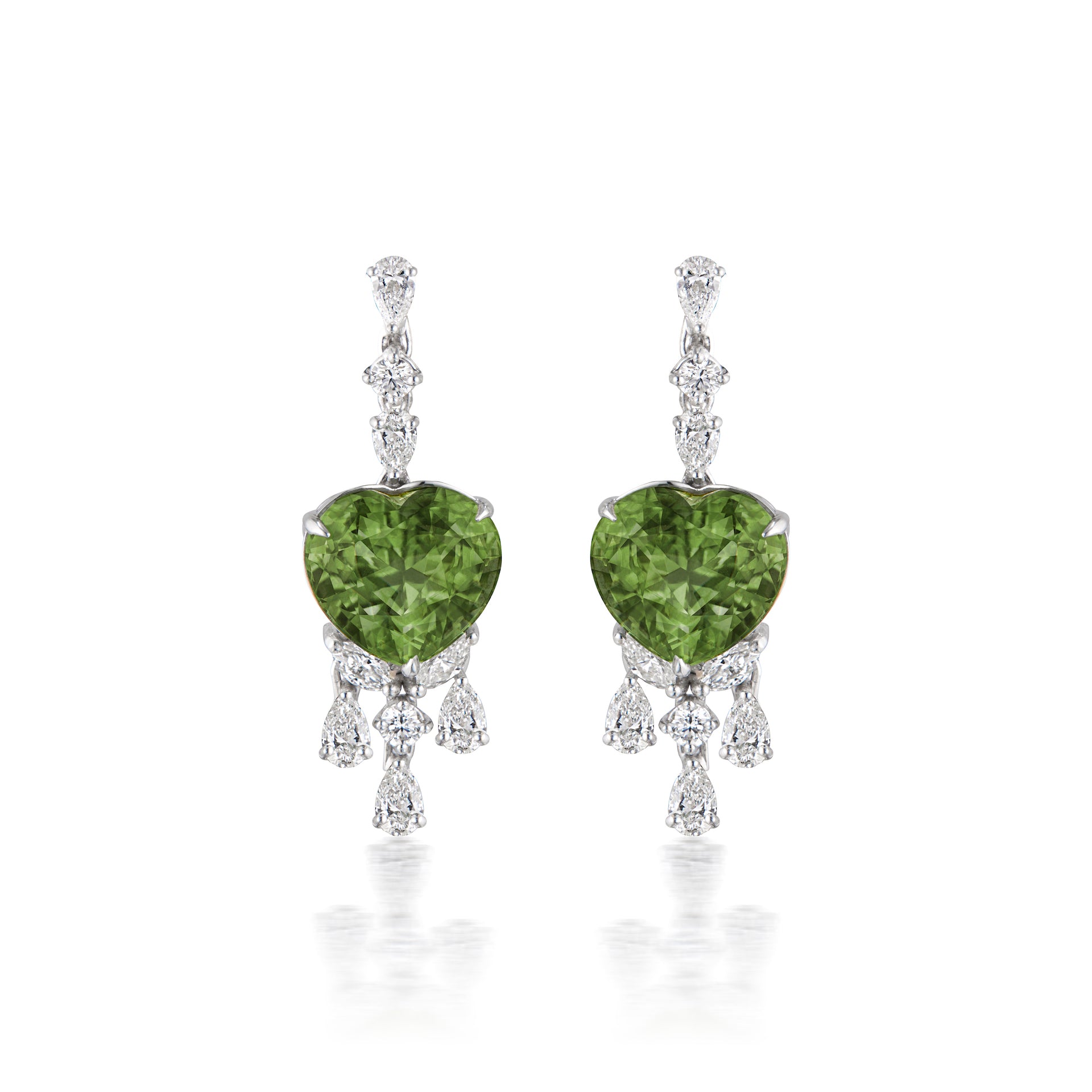 Introducing our Enchanting Peridot Earrings, a mesmerizing blend of natural beauty and feminine grace. These meticulously crafted earrings feature heart-shaped green peridots totaling 11.43 carats, symbolizing renewal and vitality.