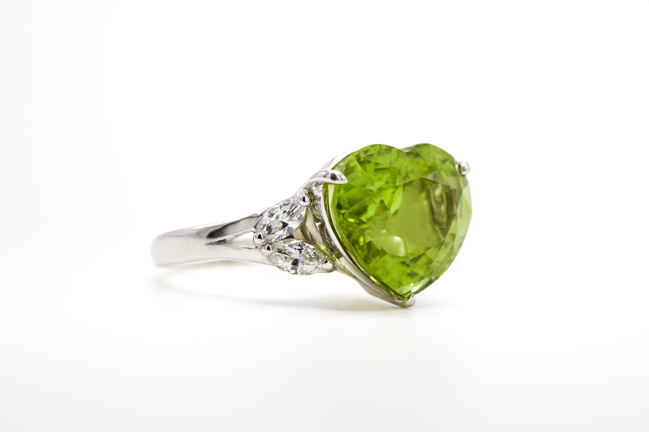 Experience a love that knows no bounds with our captivating Peridot Heart Ring—the 7.62 carat heart-shaped green peridot ring, sourced from the renowned mines of Mogok in Burma.