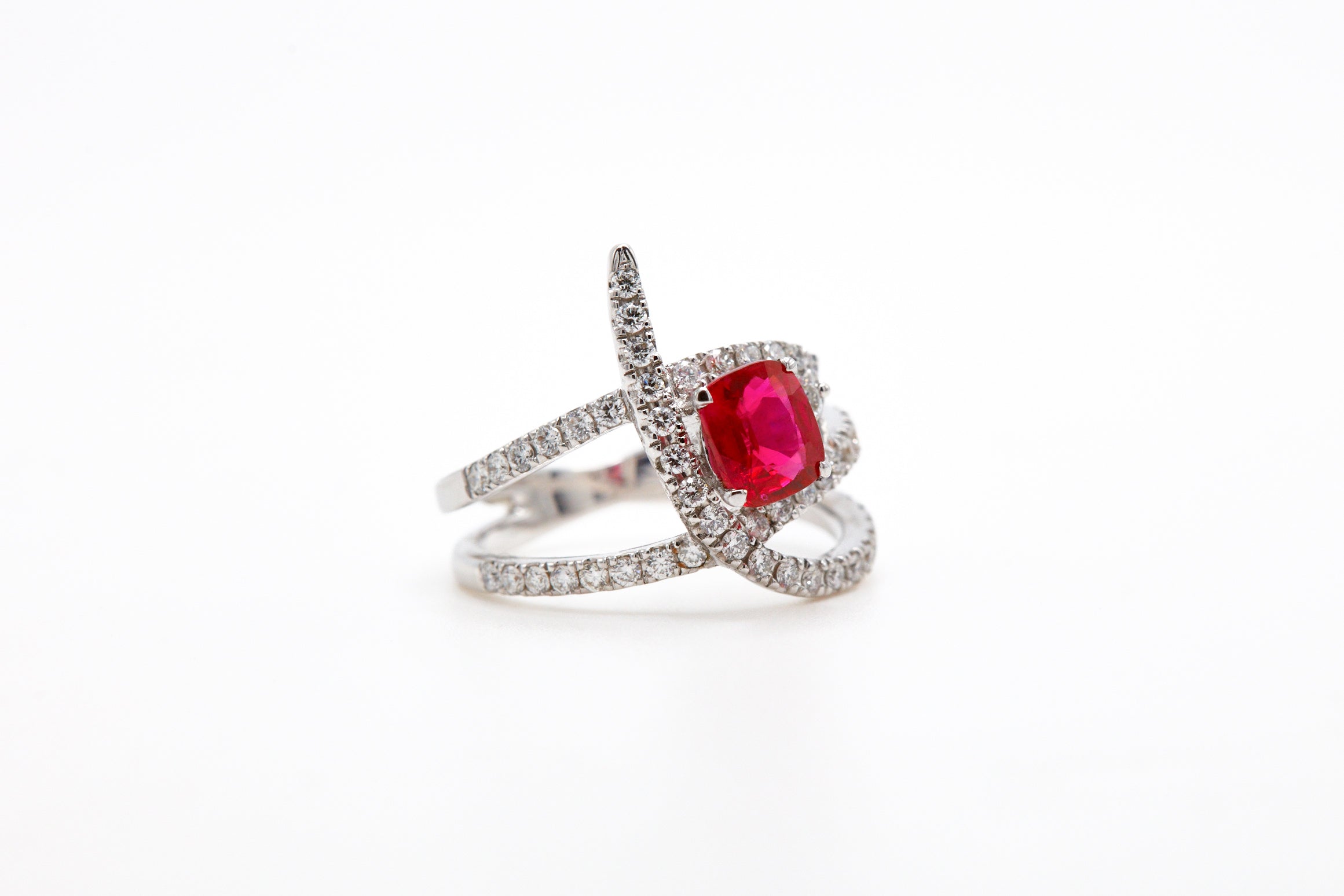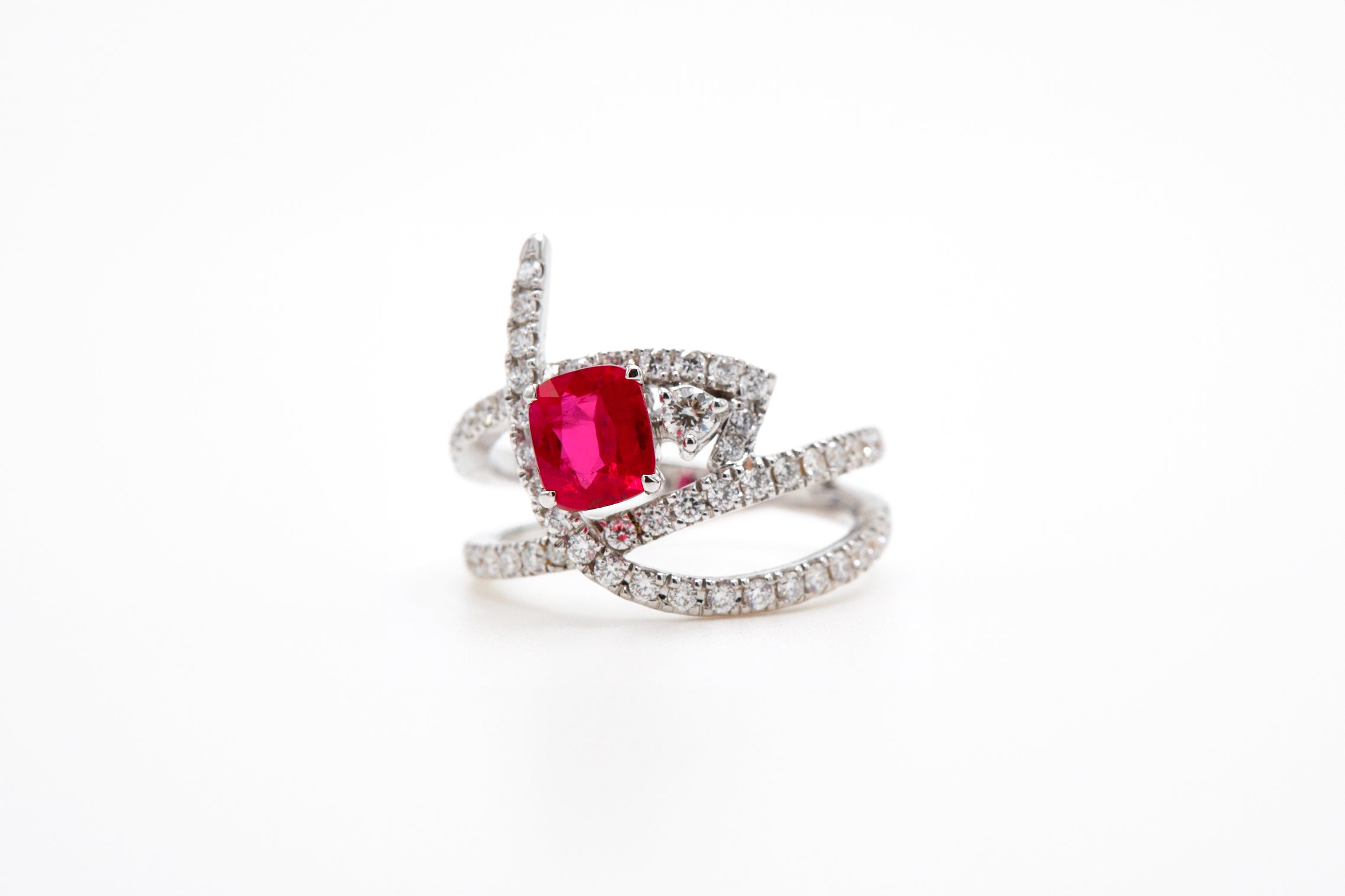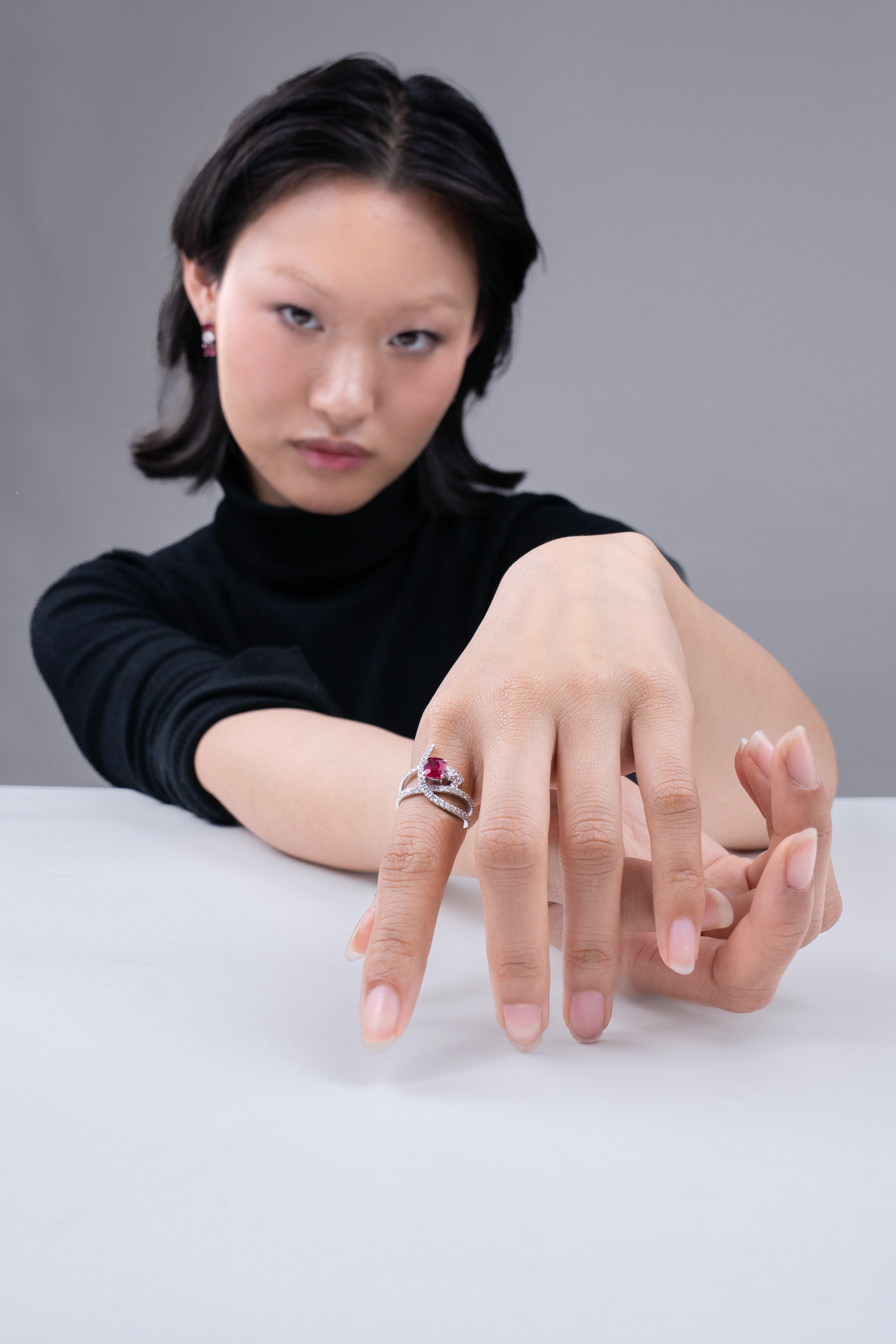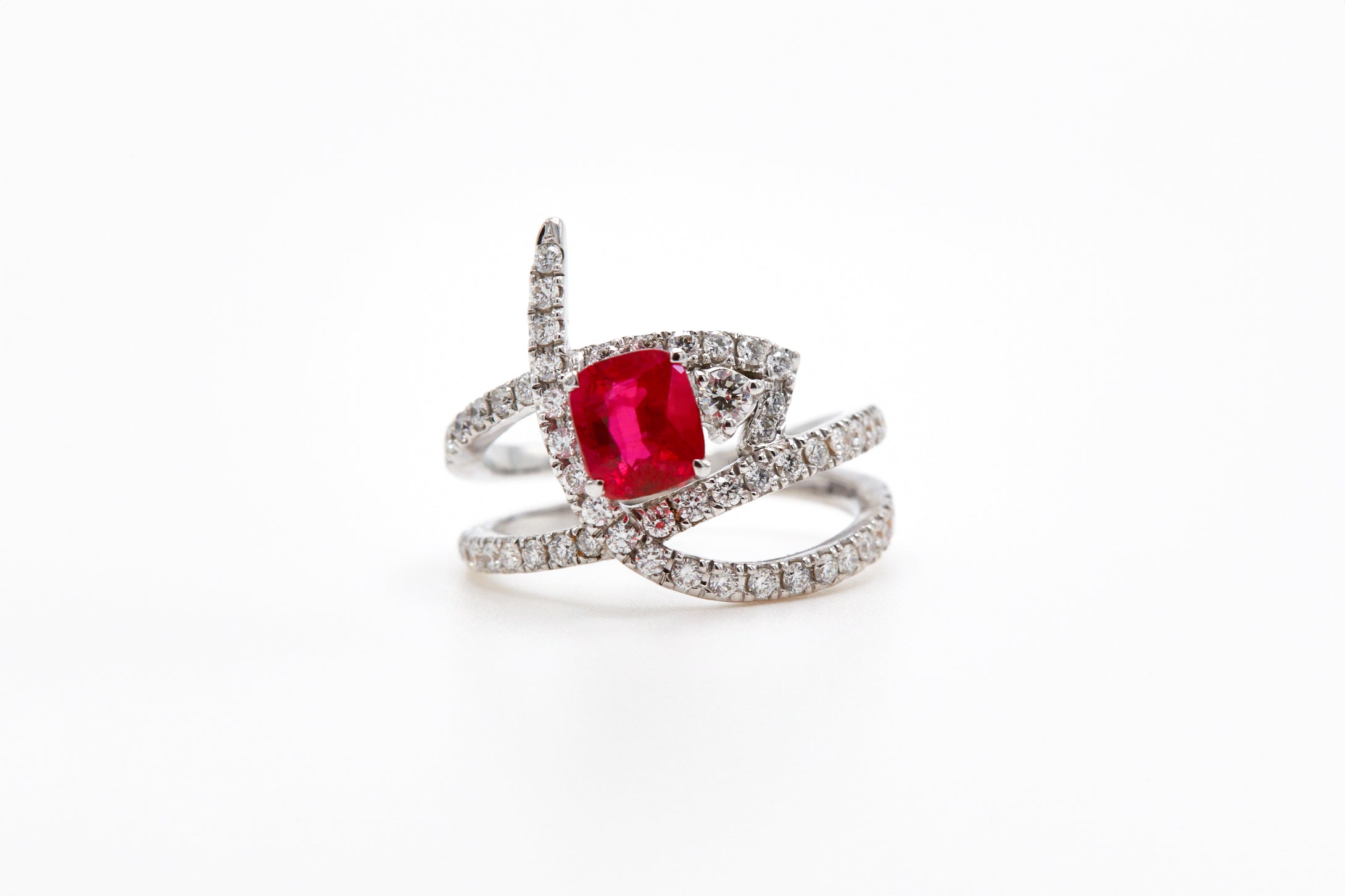 At the center of attention is a striking 1.06-carat Burma No Heat Ruby. With its vibrant red hue, this precious gemstone exudes power and allure. The absence of heat treatment ensures its authentic and natural beauty shines through, making it a truly remarkable find.