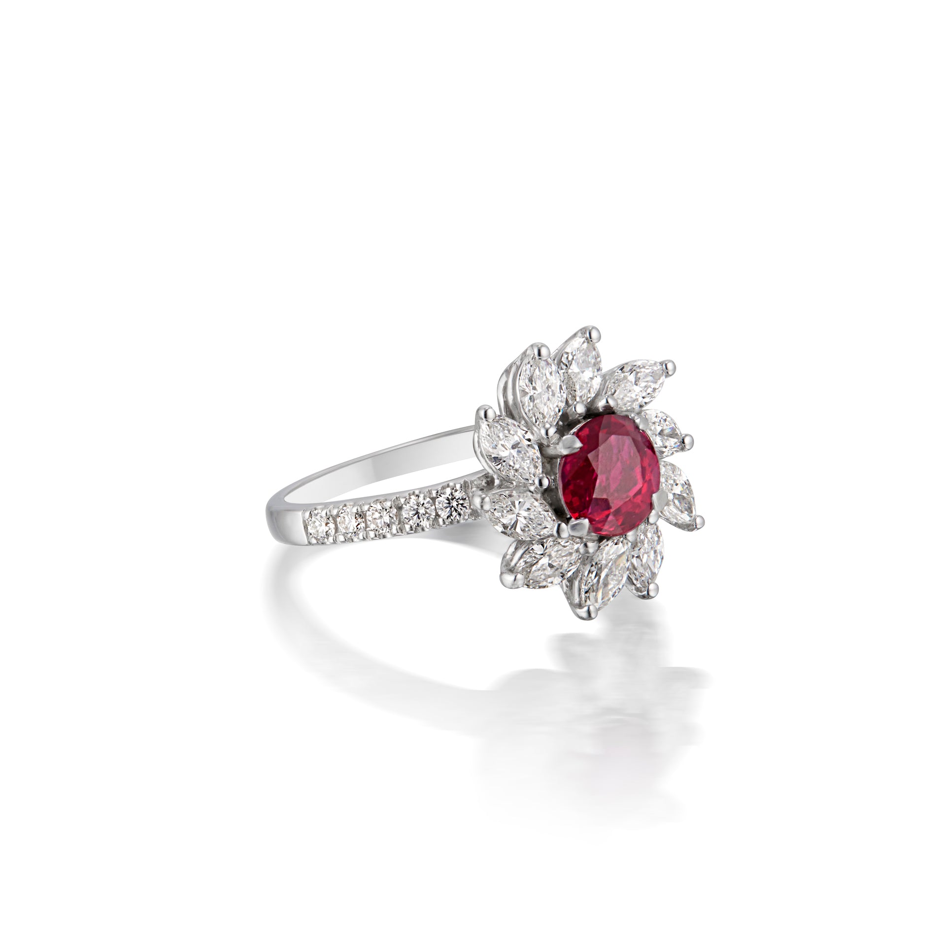 Surrounding the ruby are ten marquise diamonds, totaling 0.81 carats, gracefully accentuating its brilliance. Additionally, ten round diamonds weighing 0.16 carats add a touch of sparkle and glamour. Crafted in 18k white gold, this ring exudes luxury and sophistication.