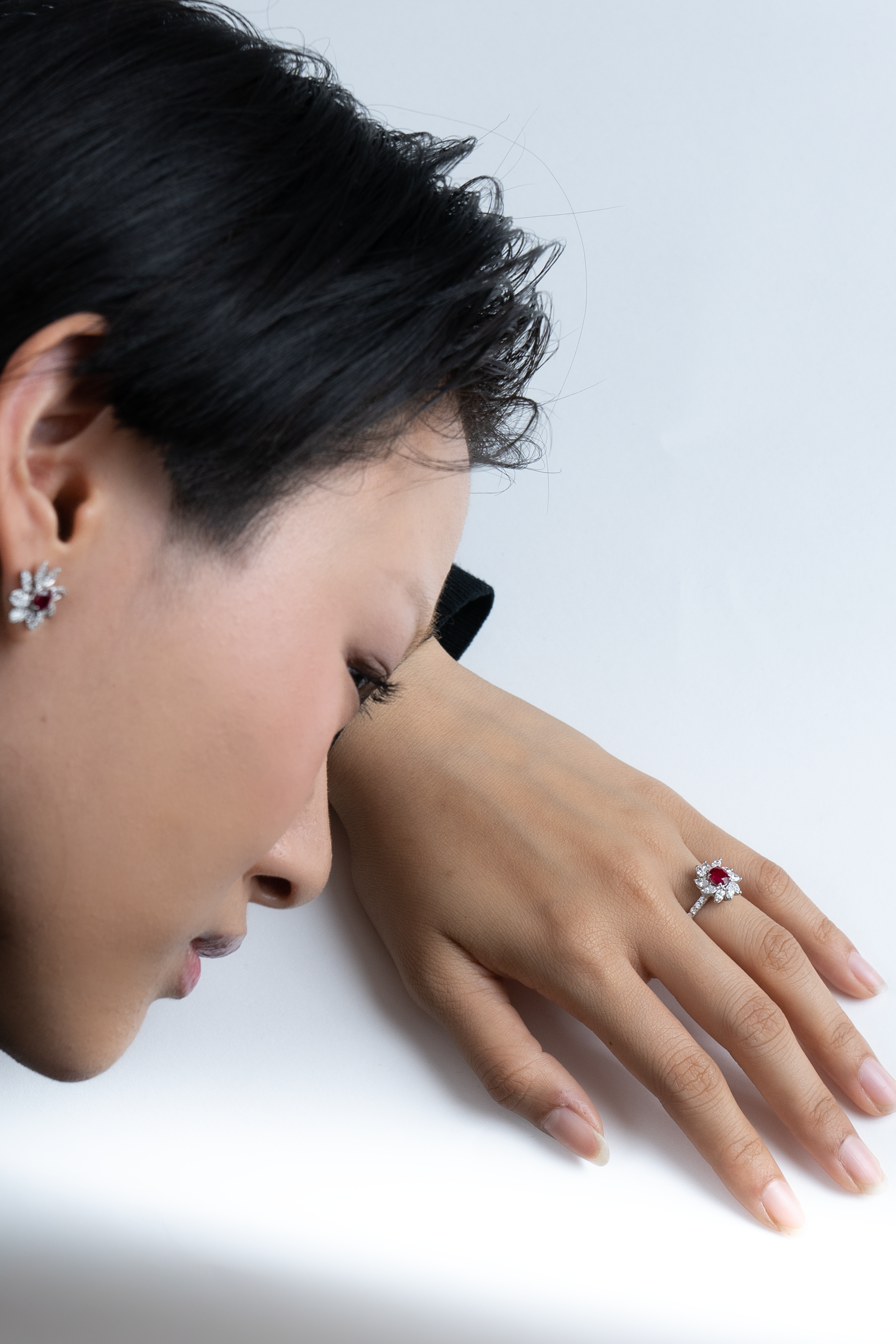 Introducing our exquisite Sunflower Ring, a masterpiece of fine jewelry. At its center lies a captivating Burma No-Heat Pigeon Blood Ruby, weighing 0.77 carats, radiating with intense beauty.